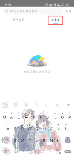 3.在搜索页面,默认搜索的是城市时景,我们选择【搜墨友】,然后再输入好友的昵称,注意只能根据昵称搜索,无法根据手机号码、用户ID搜索;