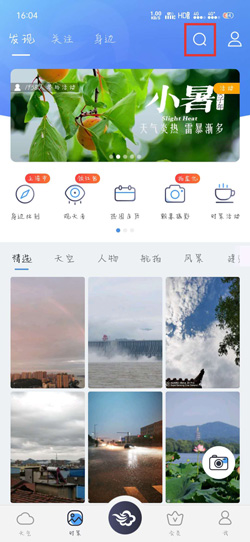 1.墨迹天气目前无法添加好友,只能进行关注,打开墨迹天气APP,在下方的功能栏中点击【时景】按钮,进入时景页面,时景页面可以查看其他用户上传的风景照片,以及天气照片;