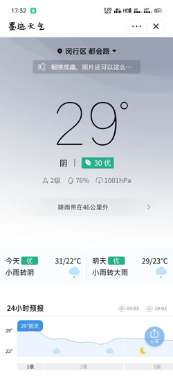 3.之后我们可以看到墨迹天气展示的温度、空气质量、风力、湿度、气压、降雨情况等等;