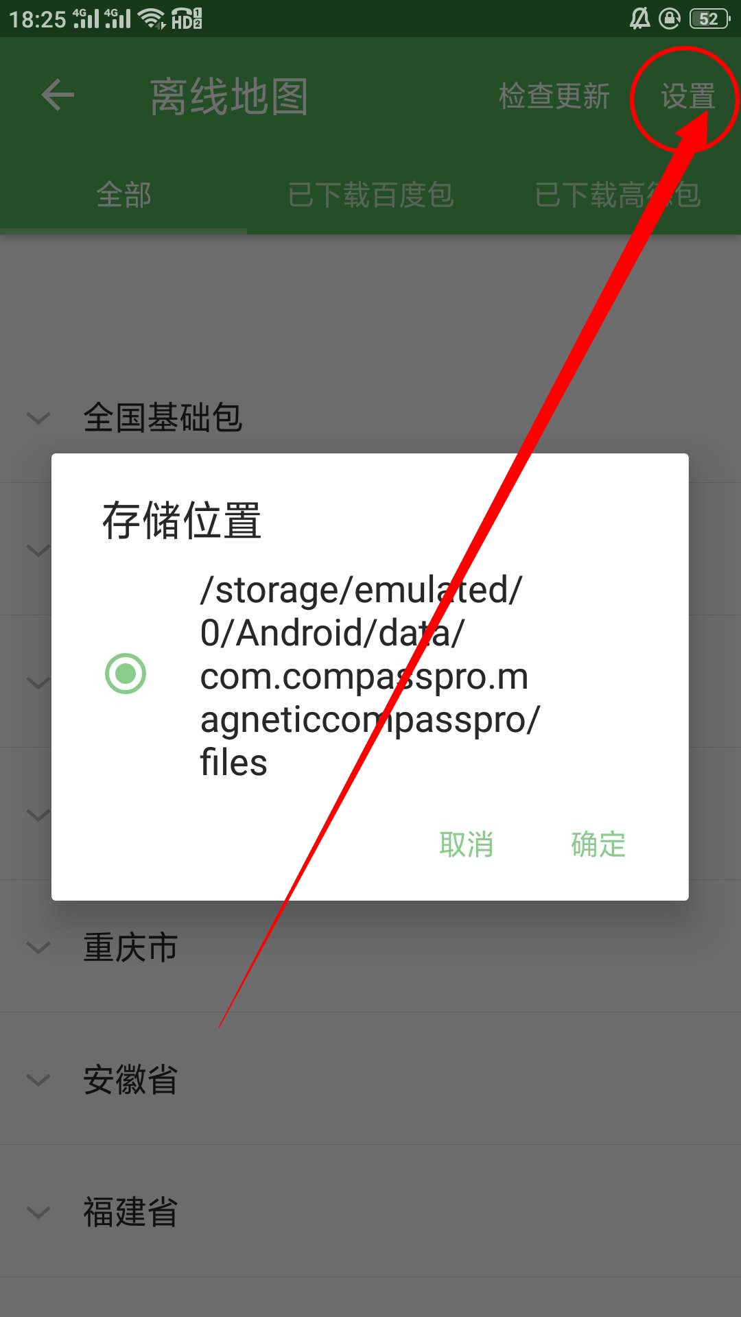 3、进入离线地图界面,点击右上方的设置即可看到下载位置。