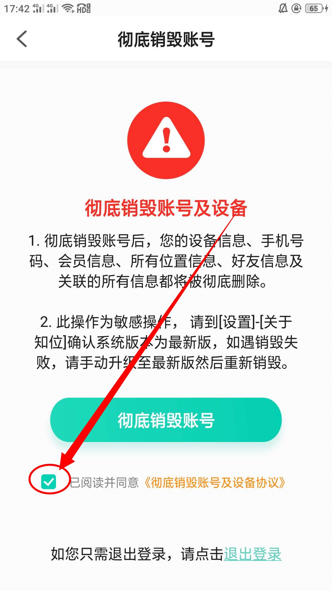 3、在销毁账号界面,钩中彻底销毁账号及设备协议,然后点击彻底销毁即可。