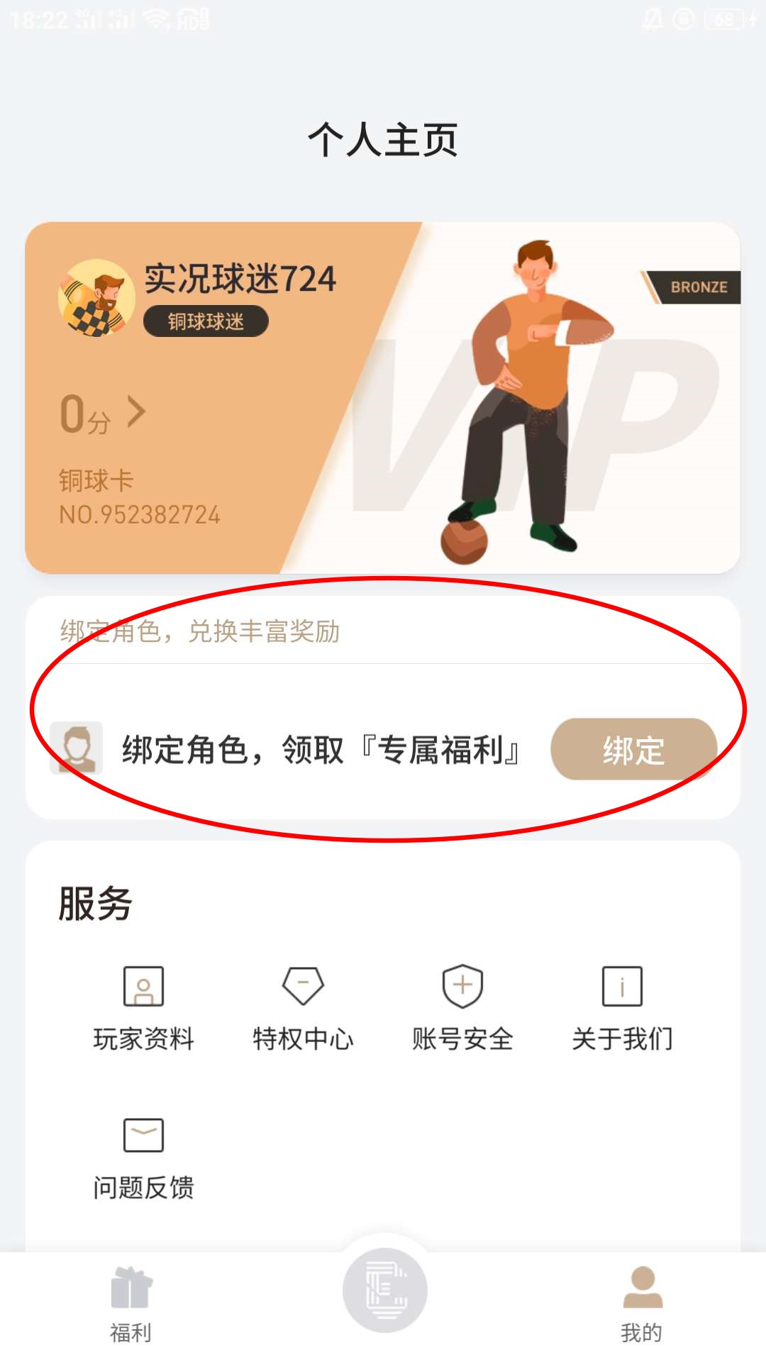 2、然后进入个人主页界面后可以看到[绑定角色,领取专属福利]的选项,点击[绑定]后即可进入绑定角色界面;