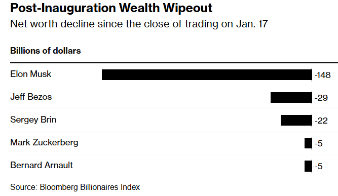 遭受巨亏的还不止马斯克。根据彭博亿万富翁指数,特朗普第二个任期开始以来的七周内,当时许多坐在国会大厦特朗普身后参加他就职典礼的亿万富翁的财富发生了惊人的逆转,其中五人总共损失了2090亿美元的财富: