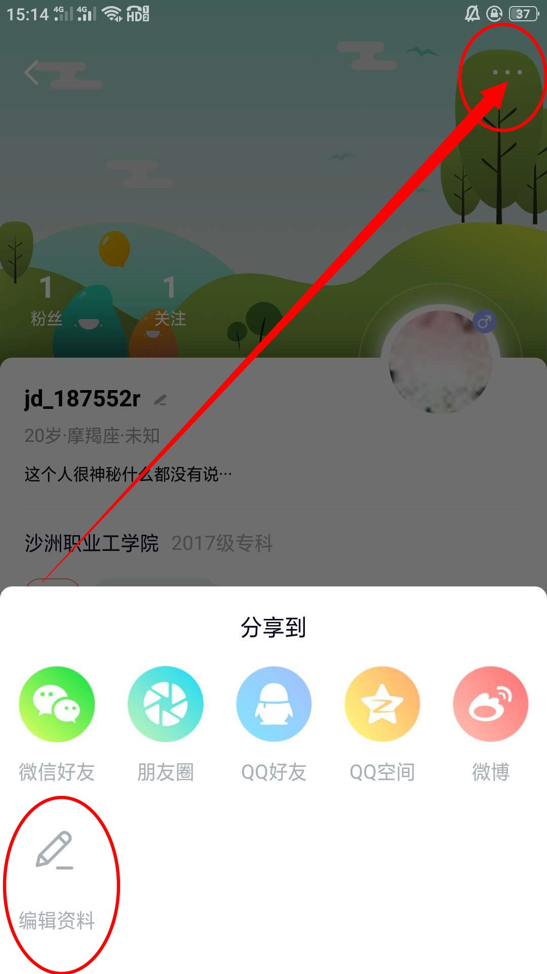 6、在个人主页界面,点击右上角的省略号,在弹出的界面中点击左下角的编辑资料。