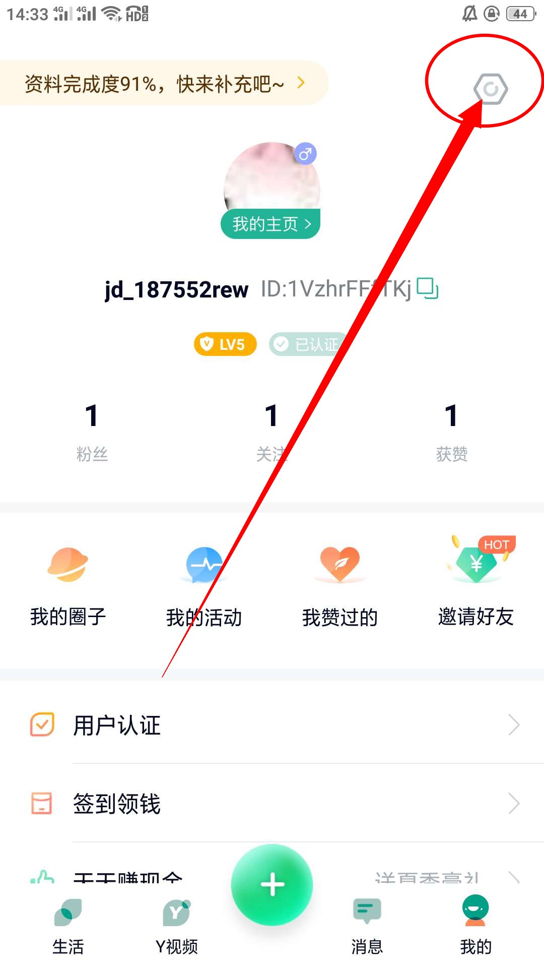 2、在(我的)界面点击右上角的圆圈设置,进入设置界面。
