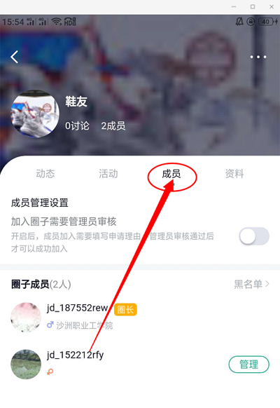2、在圈子的界面,点击成员导航栏,查看成员。