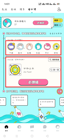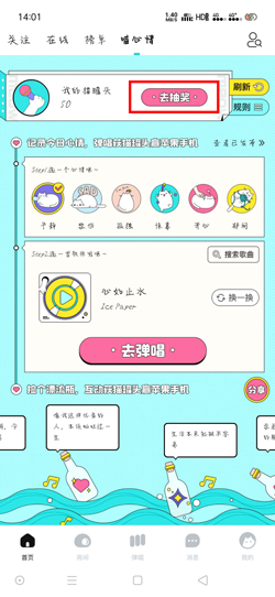 1、打开猫爪弹唱APP,在【首页】上方切换为【喵心情】进入活动页面;