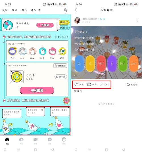 5、除了通过发布弹唱获得猫罐头之外,还可以在下方的漂流瓶处获得猫罐头,给漂流瓶转发(获得10个猫罐头,每日上限100个猫罐头)、评论(5个猫罐头,每日上限100个猫罐头)、点赞(1个猫罐头,每日上限100个猫罐头);