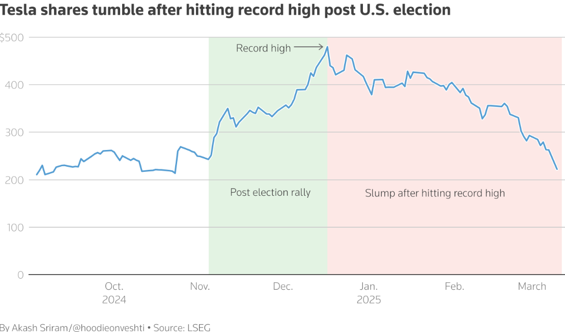 自去年12月17日创下1.5万亿美元的历史新高以来,特斯拉的市值已减少了一半多,抹去了特朗普赢得美国大选后该股的大部分涨幅。自12月以来,马斯克股价下跌的原因包括:汽车销量和利润下滑、对马斯克政治活动的抗议,以及投资者担心政治分散了这位亿万富翁对其摇钱树的注意力。