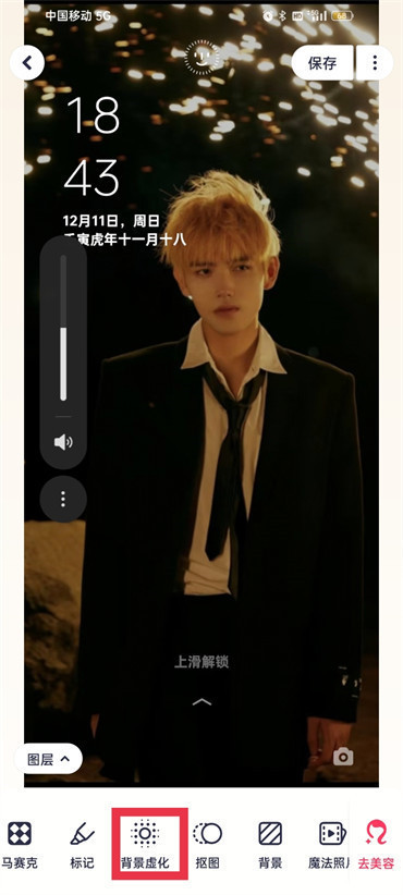 3.进入到修图的页面之后,在下面的功能区找到【背景虚化】点击,进入到背景虚化的页面之后根据自己的需求来调整即可;