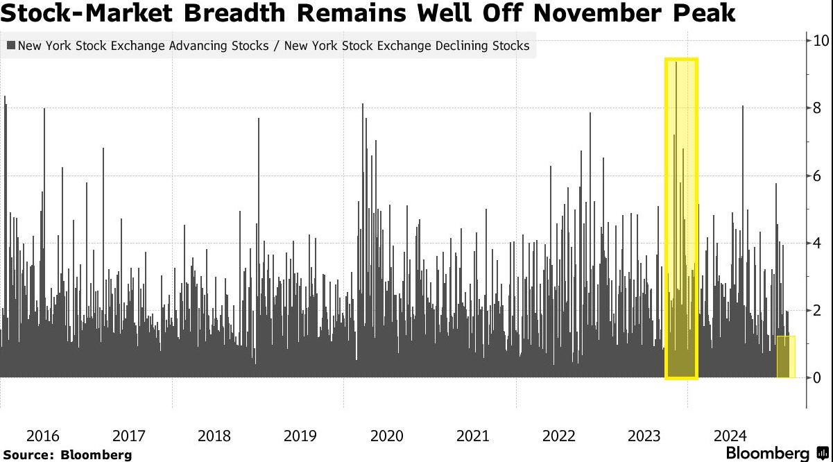 标普500指数的14天相对强弱指数周一略低于30的关键水平,这是自2023年10月以来的首次。截至周二收盘,该指数约有25%的股票位于20日移动均线上方,这是投资者转为看跌的另一个迹象。在发出解除警报的信号之前,交易员通常要看到不足10%的指数股票高于其20日移动均线。