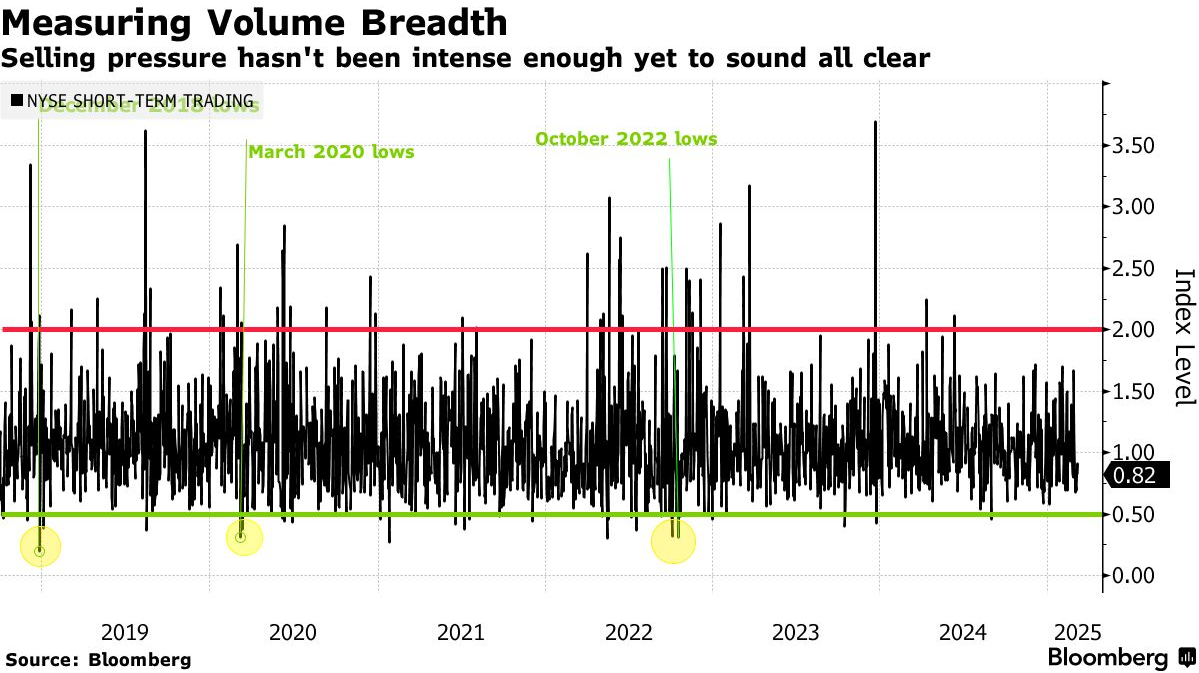 Strategas Securities公司ETF和技术策略董事总经理Todd Sohn说,该指数读数高于2.0表明投资者正在抛售股票,而低于0.5则表明股票需求增加。在周二的大跌之后,该指数为0.8,这意味着在市场准备好真正反弹之前,另一波抛售可能即将到来。