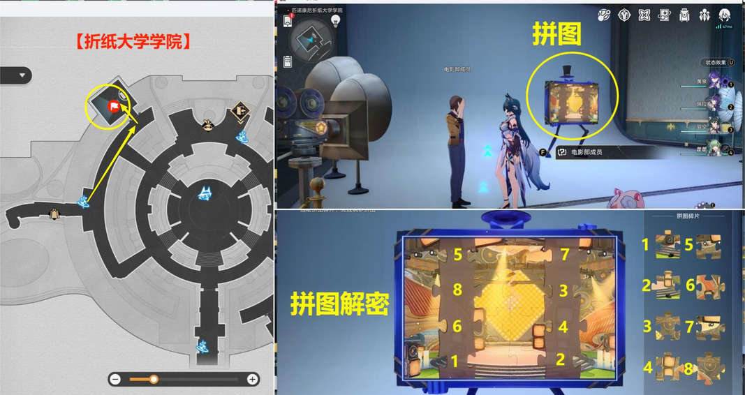 (1)完成活动后,来到【折纸大学学院】下图位置,先和【电影部成员】对完话,再完成右边的【拼图解密】后,接着再过一段剧情对话后,即可获得该成就