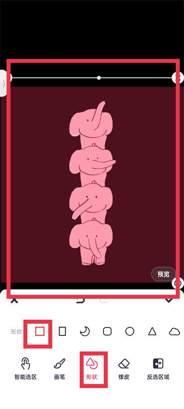 6.进入到该页面点击【形状】然后选择正方形之后在图片上框出你要的位置点击【对号】图标;