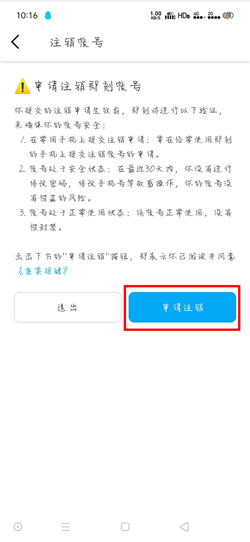 7、仔细查看并确保自己的账号符合注销条件:在常用手机上提交申请、账号处于安全状态、账号处于正常使用状态,最后点击【申请注销】提交账号注销申请。