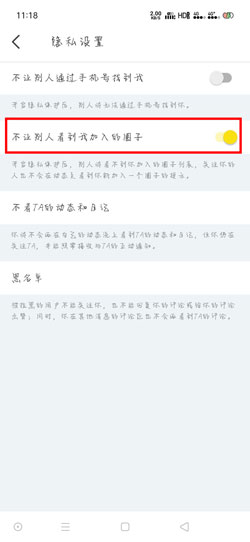 4、最后将【不让别人看到我加入的圈子】功能开启,开启该功能之后,我们的个人主页页面不在显示“TA的圈子”。