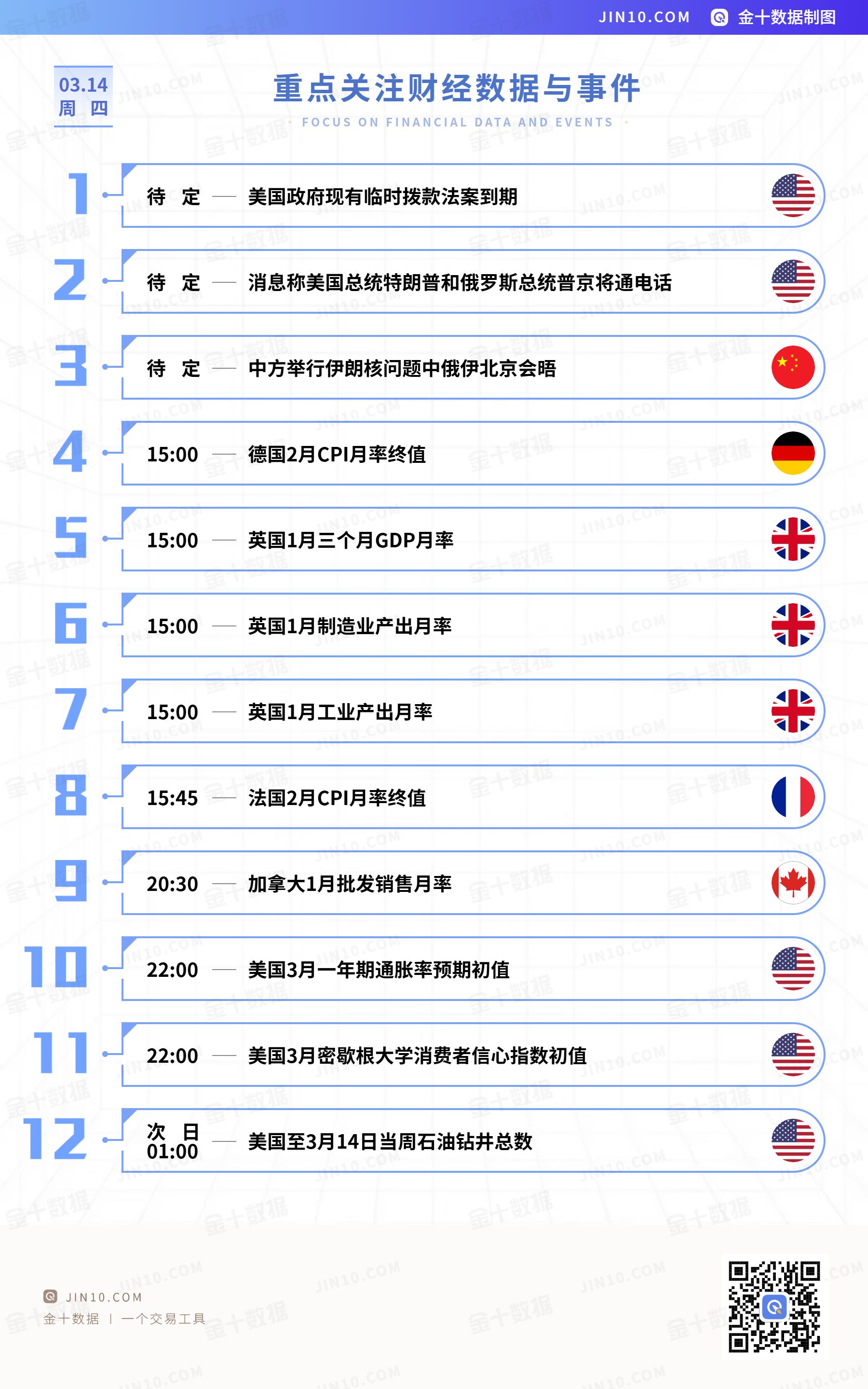 15:00,德国2月CPI月率终值、英国1月三个月GDP月率、英国1月制造业产出月率、英国1月季调后商品贸易帐、英国1月工业产出月率