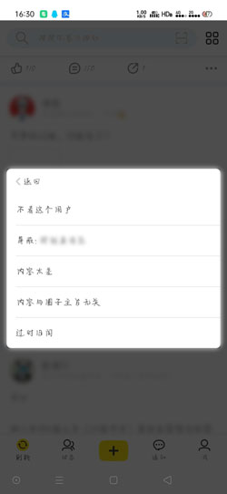 3、选择不感兴趣的理由,例如:不看这个用户、屏蔽:XX(圈子)、内容太差、内容与圈子主旨五关、过时旧闻,点击选择不感兴趣理由即可屏蔽该内容,同时还会减少该类型的推送。