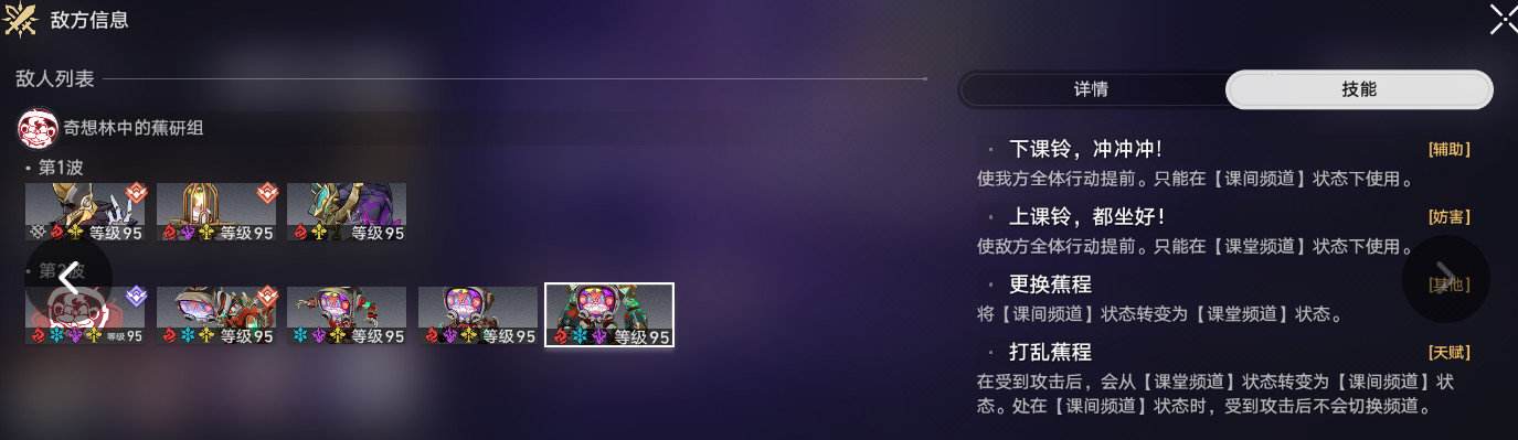 在行动条上添加【期末晚会】,每次【期末晚会】行动时,解除场上所有【蕉研组】成员的控制类负面状态与弱点击破状态,将全体【蕉研组】的【课间频道】状态转变为【课堂频道】状态,并施放【致博士:蕉学成果汇演】。每当有一名【蕉研组】成员的弱点被击破时,【期末晚会】的行动将小幅延后。
