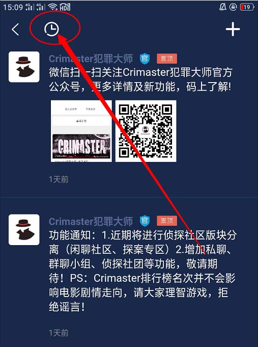 1、进入侦探社区,在左上角有一个时钟标志,点击进入。