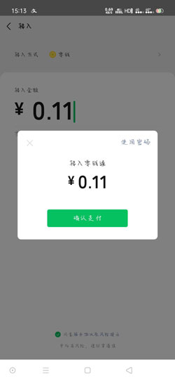 6、最后点击【确认支付】,使用支付密码或者指纹支付,支付成功后就可以将零钱、银行卡内的资金转入零钱通。