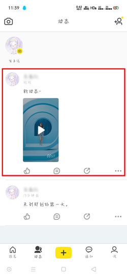 7、发布视频之后,在动态页面可以看到我们刚刚发布的视频动态,如果有好友点赞或者评论也可以在该页面查看。