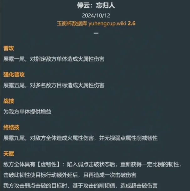 1、她的终结技是释放九尾,对敌方全体造成火属性的范围性打击,同时无视弱点削减韧性。