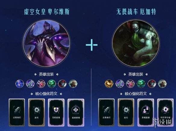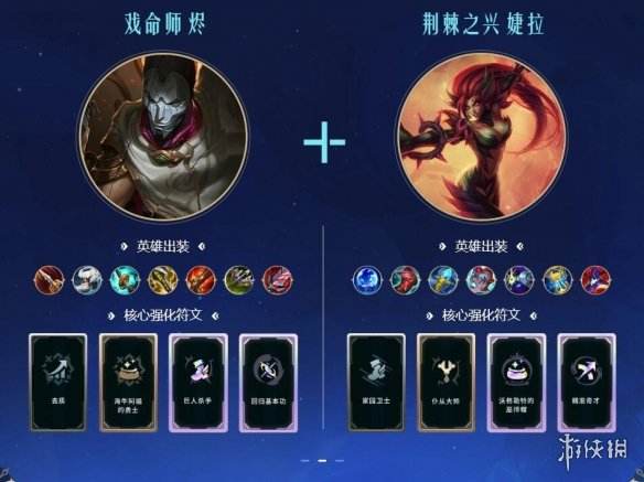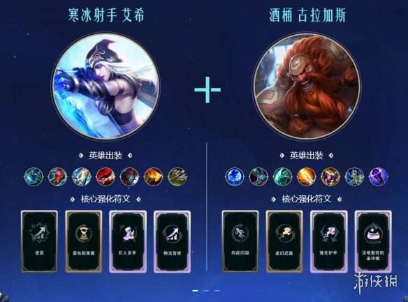 新装备花晓之剑拥有超强的普攻回复效果,搭配上两个普攻频率特别高的英雄拥有很强的坦度和击杀能力,厄加特的W技能和卑尔维斯的E技能都可以频繁触发装备特效,同时两个人的面板属性较高战斗力也是十分强劲。