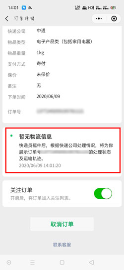 4、进入订单详情页面之后,滑动到最下方,在“关注订单”上方查看快递物流信息。