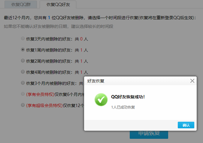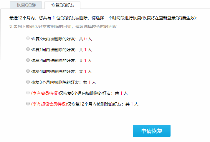 普通用户可以申请恢复3个月内删除的全部好友;会员用户可以申请恢复6个月内删除的全部好友 (查看会员特权详情)