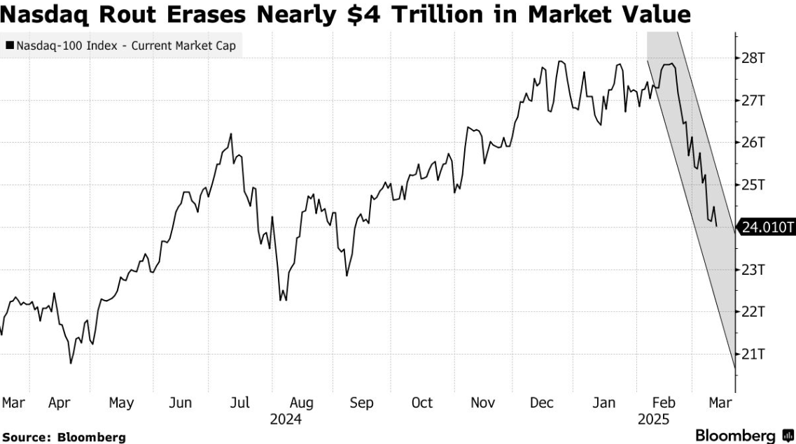 这是一个显著的大转变。就在大约一个月前,Alphabet和亚马逊等科技巨头还在创出新高,投资者纷纷涌入美股,因为他们当时预计特朗普政府的政策将刺激经济增长,并减轻监管。特朗普和其他官员已明确表示,为了实现大幅调整美国经济的长期目标,他们可以接受股市损失和短期经济痛苦,因此这些假设已破灭。