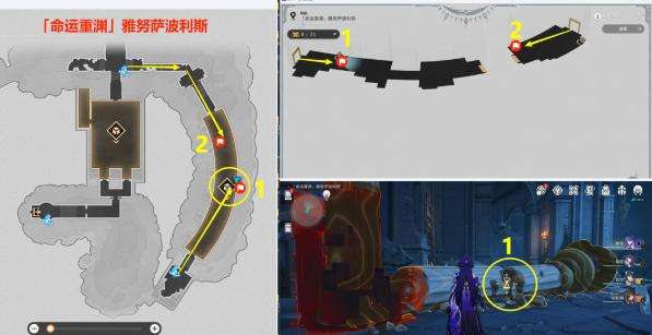 4、柱倒啦—:在1的位置回溯石柱,回快速站在石柱下面,让倒下的石柱砸中,即可获得该成就,如果传送点没开,可以从上面传送点去2处倒地石柱,完成成就。