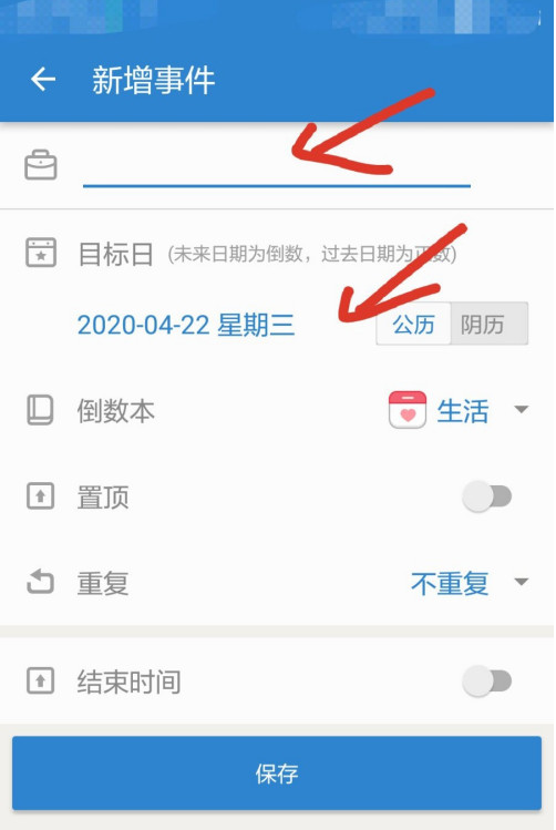 2、在新增事件界面,编辑您想添加的事件名字和目标时间,和其它的设置。