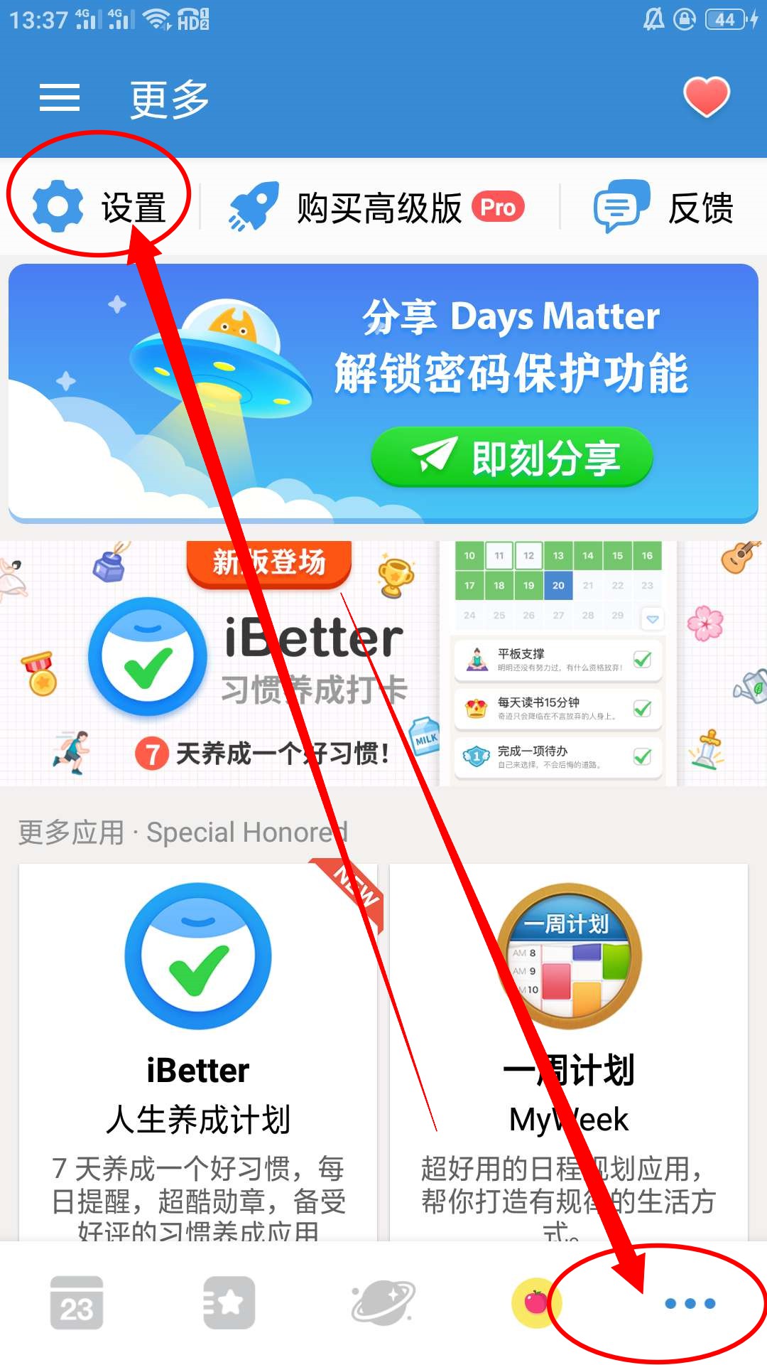1、进入倒数日APP,在下方的导航栏中点击(省略号),再省略号界面中点击左上方的设置。