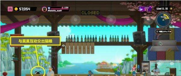 4、白天前往寿司店,与柜台上的莫莫互动,交给它猫粮并喂食。