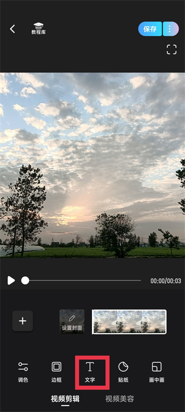 3.进入到编辑的页面之后在页面下方滑动找到【文字】点击;