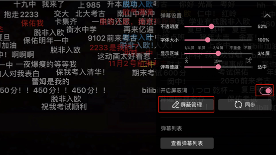 开启弹幕屏蔽列表功能,即可根据设置的屏蔽关键词和正则屏蔽一些弹幕内容。
