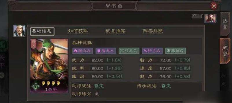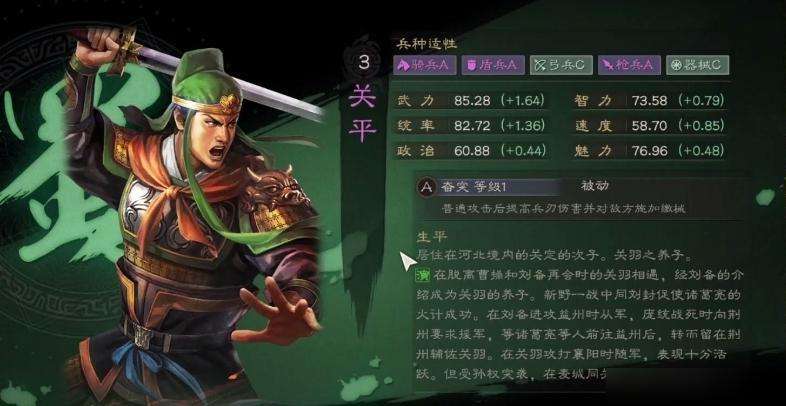 关平的属性其实并不出色,他的统率值和武力值都不是很高,比较中规中矩吧。但是他拥有的盾兵、骑兵还有枪兵都是处在最好的水平,这在紫色武将中可以说是十分难得了。这些兵种让关平在攻占敌方势力的时候能更加灵活,可以随意切换兵种,根据敌方的具体情况来进行克制,这样兵力不会大幅度的减少,也能节约资源。