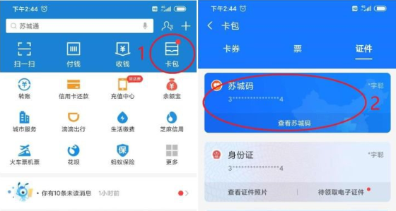 2、在支付宝中点击首页的卡包,在卡包中找到苏城码,即可急速完成出示二维码。