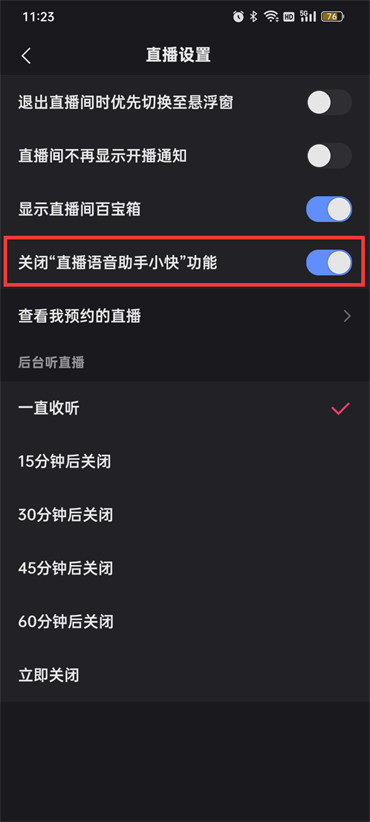 5.最后在直播设置的页面中点击关闭【关闭“直播语音助手小快”】即可打开;