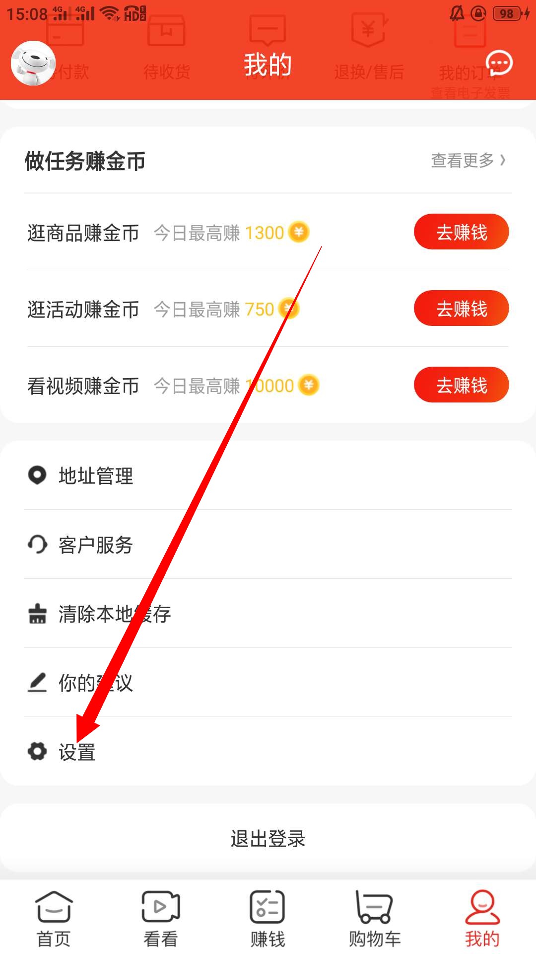 1、进入京东极速版,点击下方我,进入我的界面,下拉找到设置,进入设置界面。