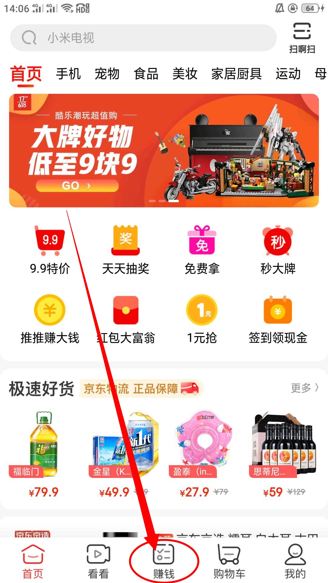 1、手机打开【京东极速版】,首页点击下方【赚钱】按钮。