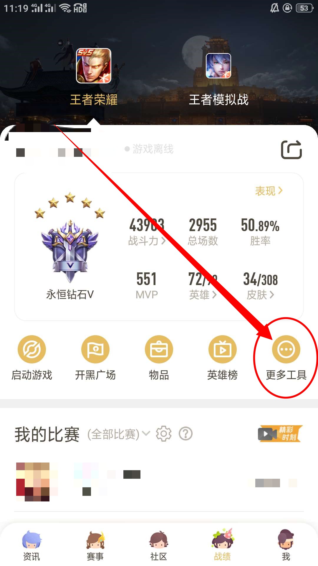 1、进入王者营地APP中,在战绩界面找到更多工具。