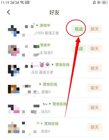 3、在好友列表中可以看到有好友正在游戏,点击观战,即可进入游戏进行观战好友的比赛。(注:会跳转到游戏中观看。)