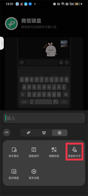 1.首先打开微信键盘软件,进入到此页面之后往上滑动找到【语音转文字】点击;