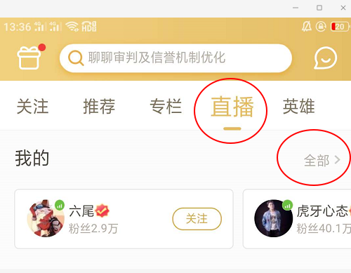 1、进入王者营地在首页界面点击直播,在下方我的,点击全部。