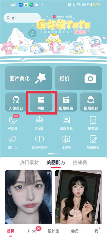 1.首先打开美图秀秀软件,进入到美图秀秀页面之后点击【拼图】;