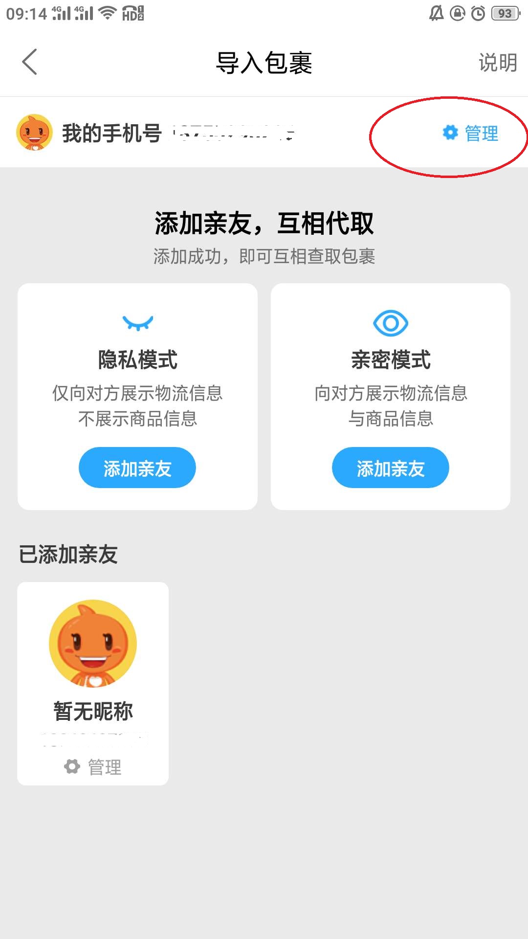 2、导入包裹界面,点击右上方的管理,进入管理。