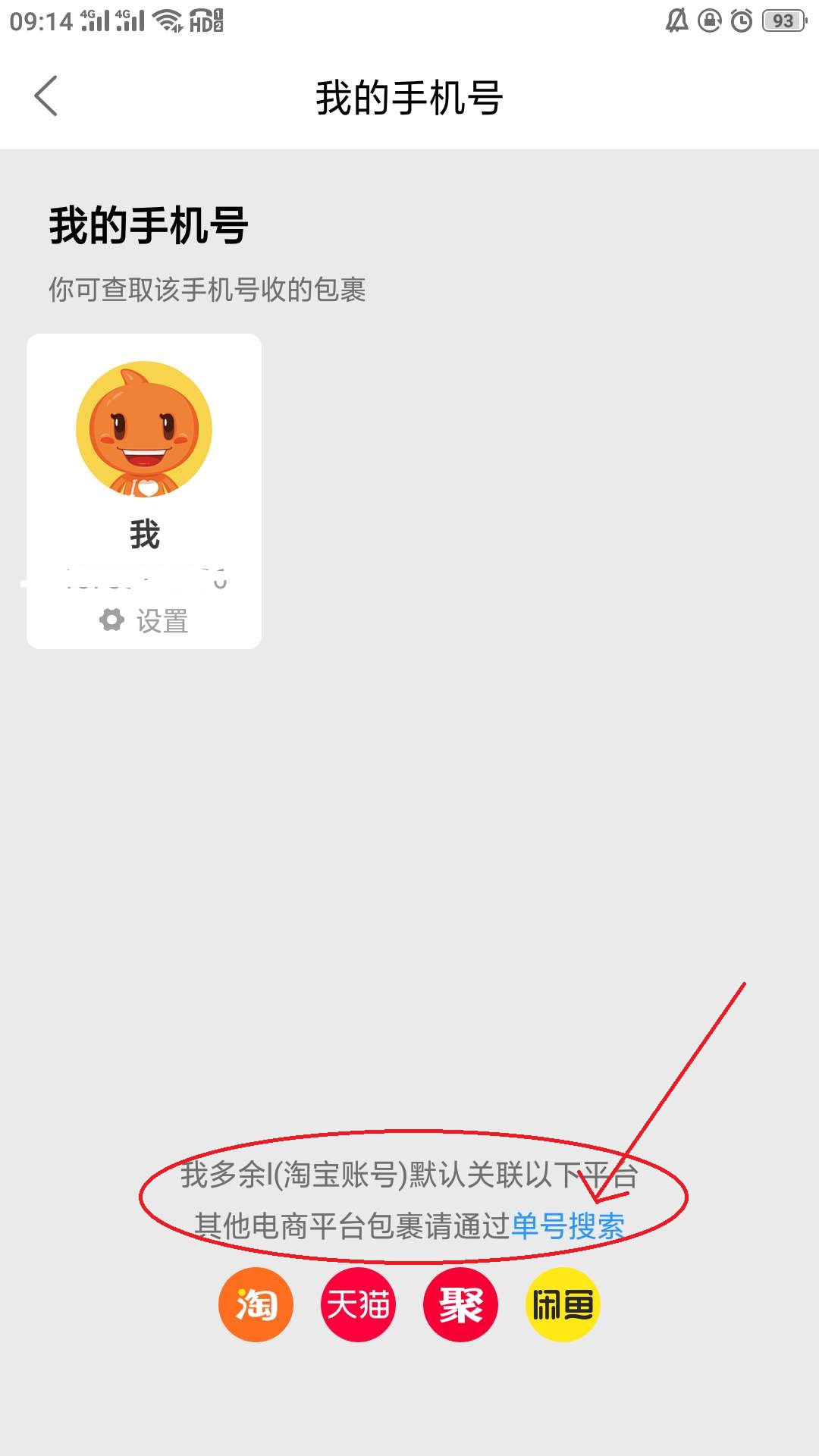 3、进入我的手机号管理里界面,点击下方蓝色字体“单号搜索”进入单号查询页。