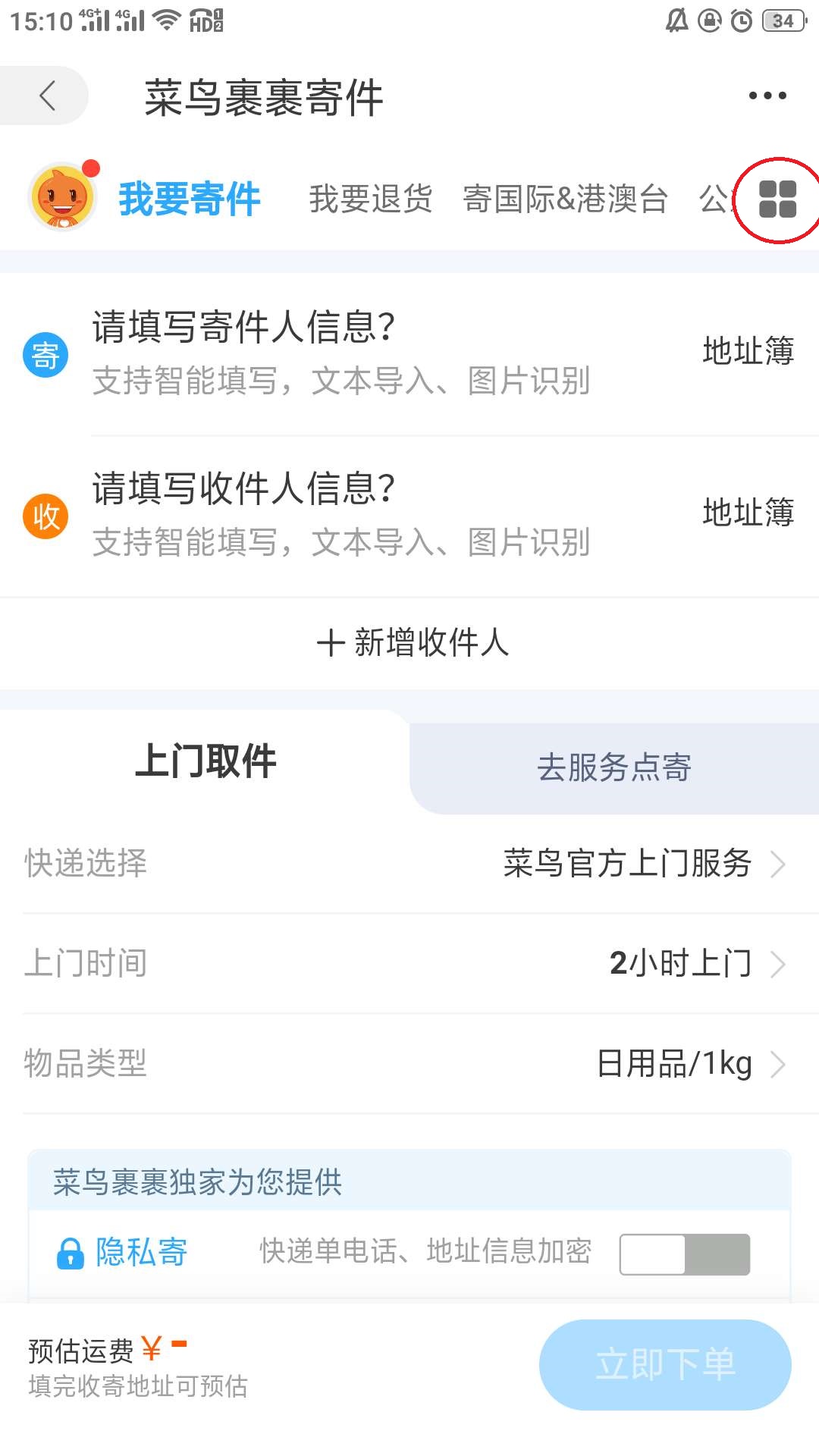 2、因为快递员取件功能是快递员抢单,所以不能自由选择快递公司。这时想自己选择快递公司的伙伴们可以点击右上方的【方块】